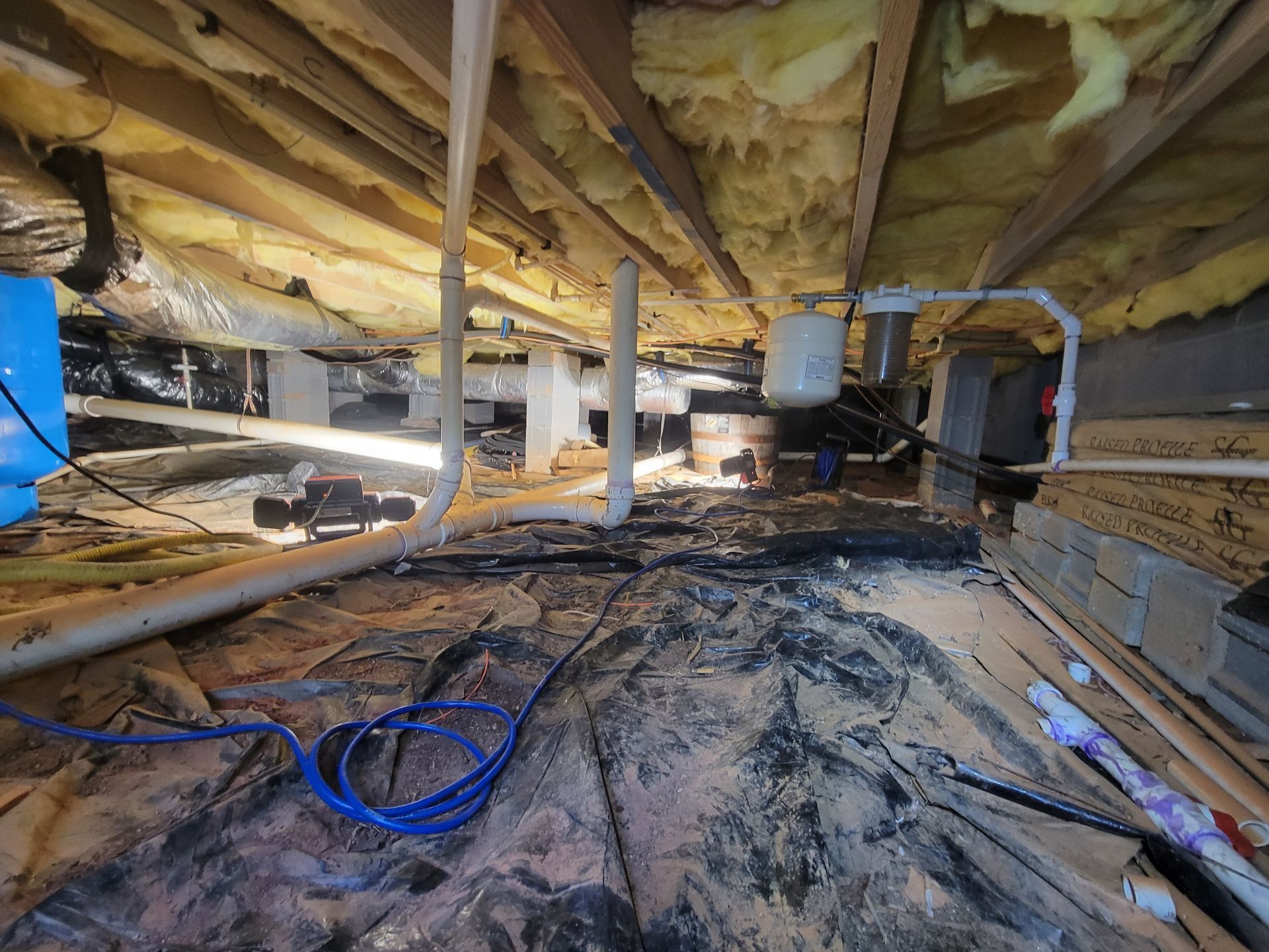 NOTE ON GROUND COVERAGE: If your crawlspace has an interior French drain in place, it may be exposed, at least on the sides of the home where water is entering. If you see that your crawlspace has a moisture barrier over all areas, except over your drain that is okay. Water that is entering the crawlspace must be able to enter the drain. If the drain is covered by the barrier, it is possible for water to run directly on top of the barrier, move across the crawlspace and pool in other areas.